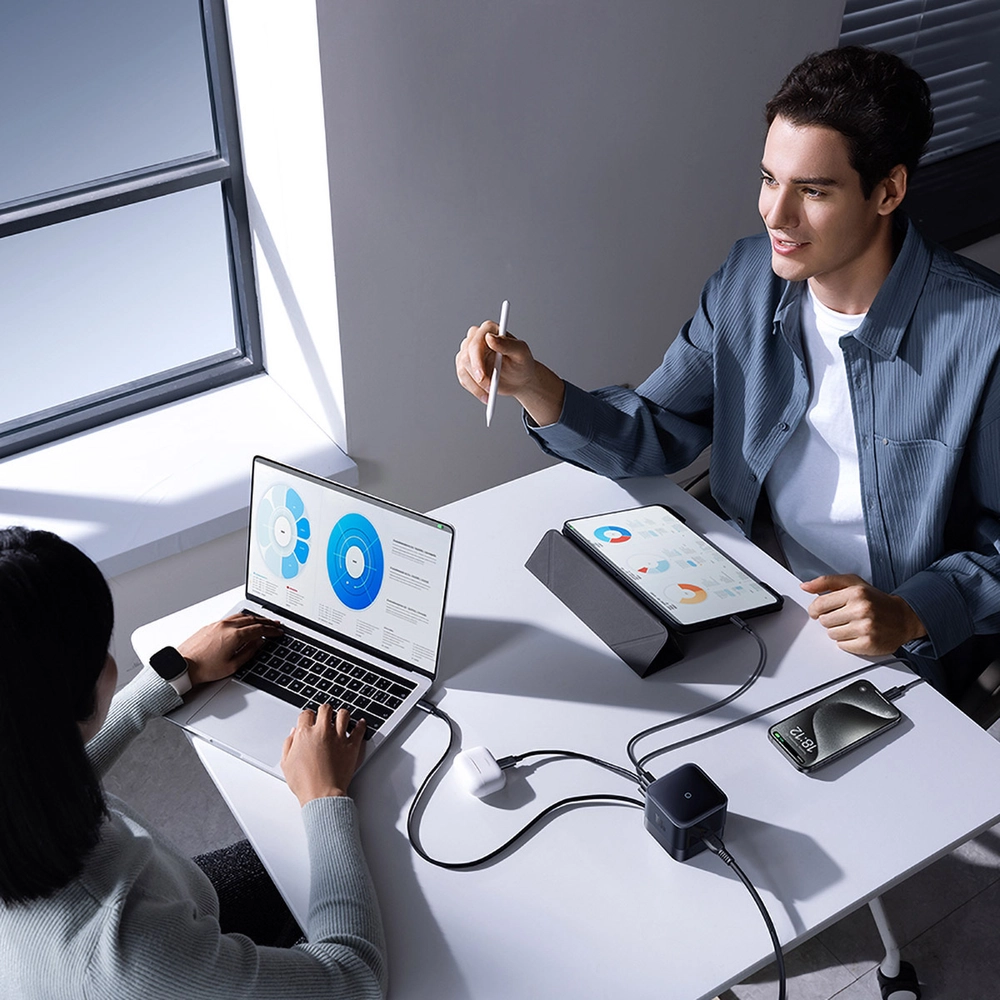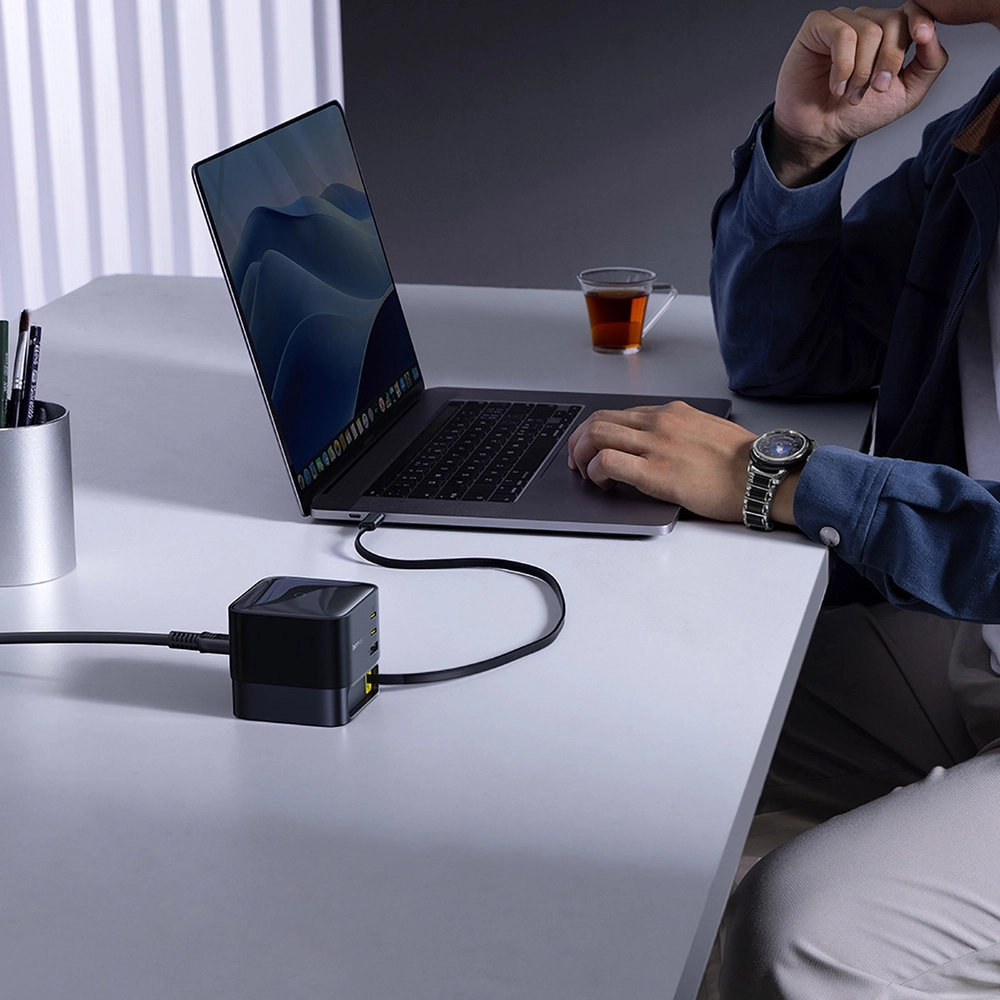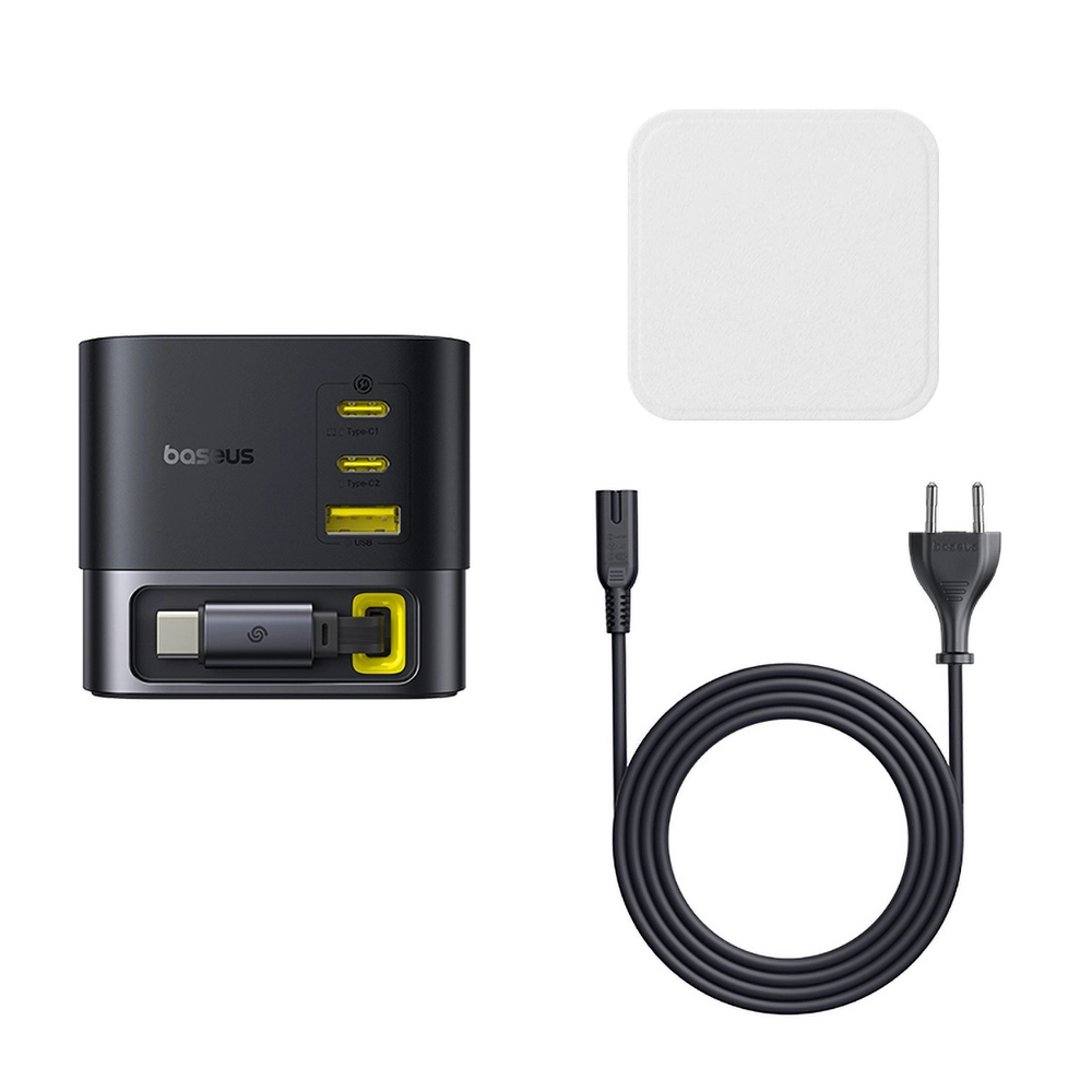 Baseus firmasından 100W gücündə 3 USB-C, 1 USB-A çıxışlı, yığıla bilən kabelli Super GaN 6 stolüstü şarj cihazı