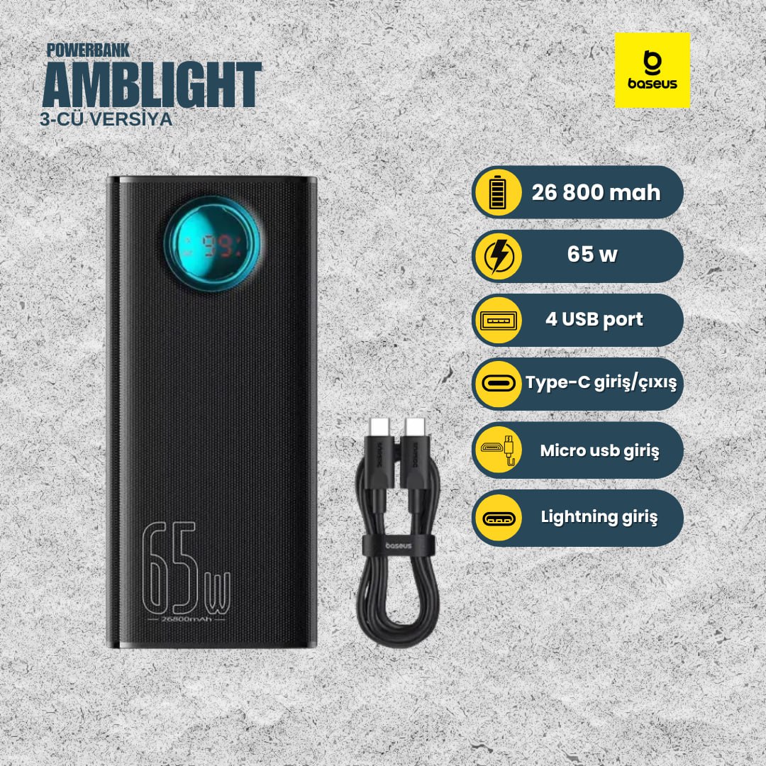 Baseus firmasından 26800mAh batareya tutumuna malik 65W sürətli şarj sistemli power bank