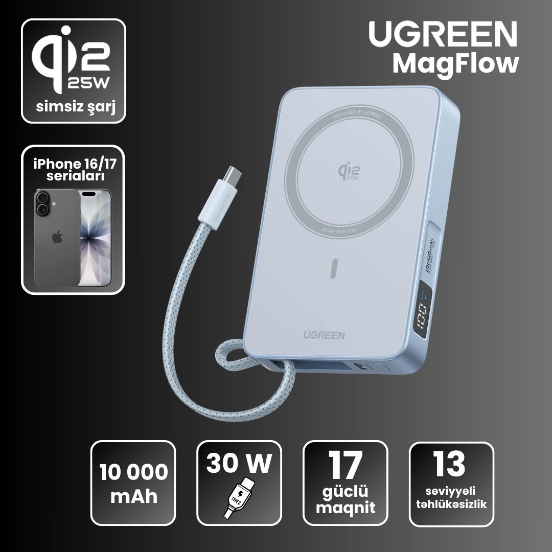 Ugreen firmasından MagFlow seriyasına məxsus, 10.000mAh tutumlu 25W gücündə maqnitli simsiz şarj cihazı